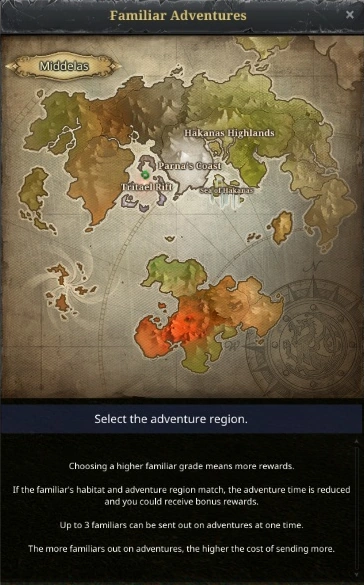At this time, you can select from 4 different regions with a total of 10 different areas to send your familiars. Familiar Adventure allows you to select up to 3 MAX level familiars and send them on an adventure. When they have successfully completed their adventure and return, it will provide you with rewards based on the adventure. These rewards include items such as Familiar EXP boost, Familiar Coins and even Heroic Refining Stones.