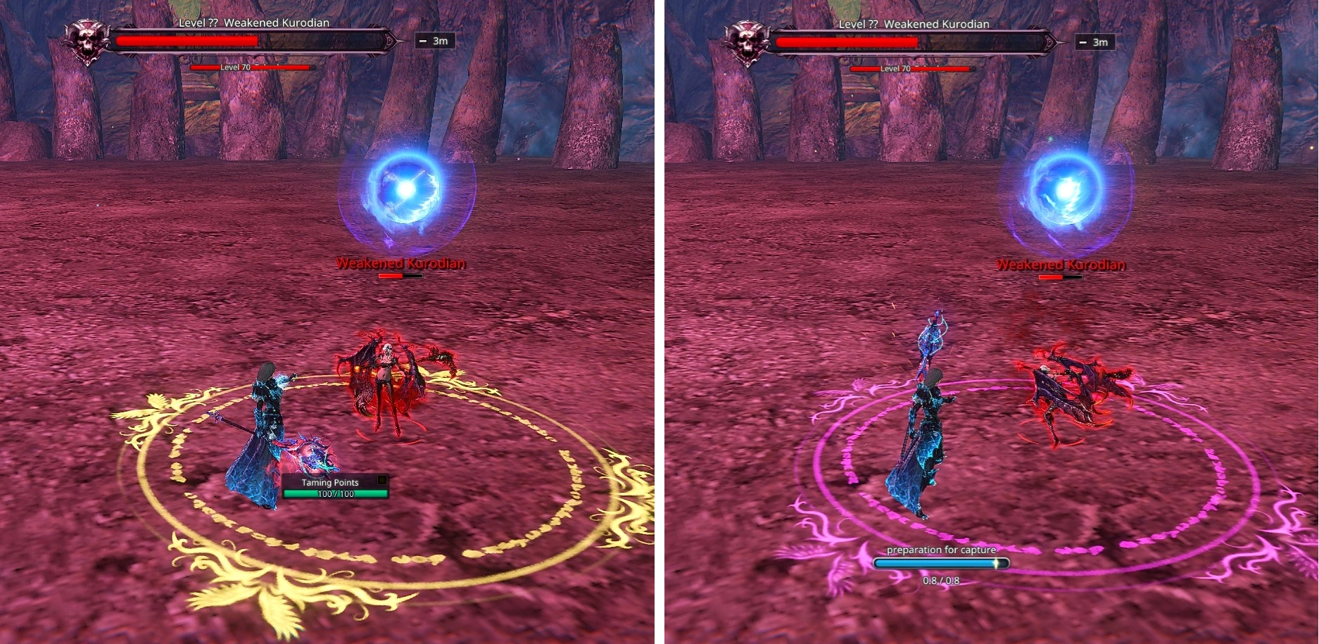 Make sure that you have the corresponding monster beads in your inventory bag. If you are using Fated Beads, a simple Capture Card will suffice, but if you are using regular beads, try to use a Shining Capture Card as it will increase your capturing chance. Similarly to familiar taming, once the capture started, a sequence of letters (W,A,S,D) will appear in random order. Press the corresponding keys on your keyboard. When the capturing mini-game is done correctly the success bar increases.